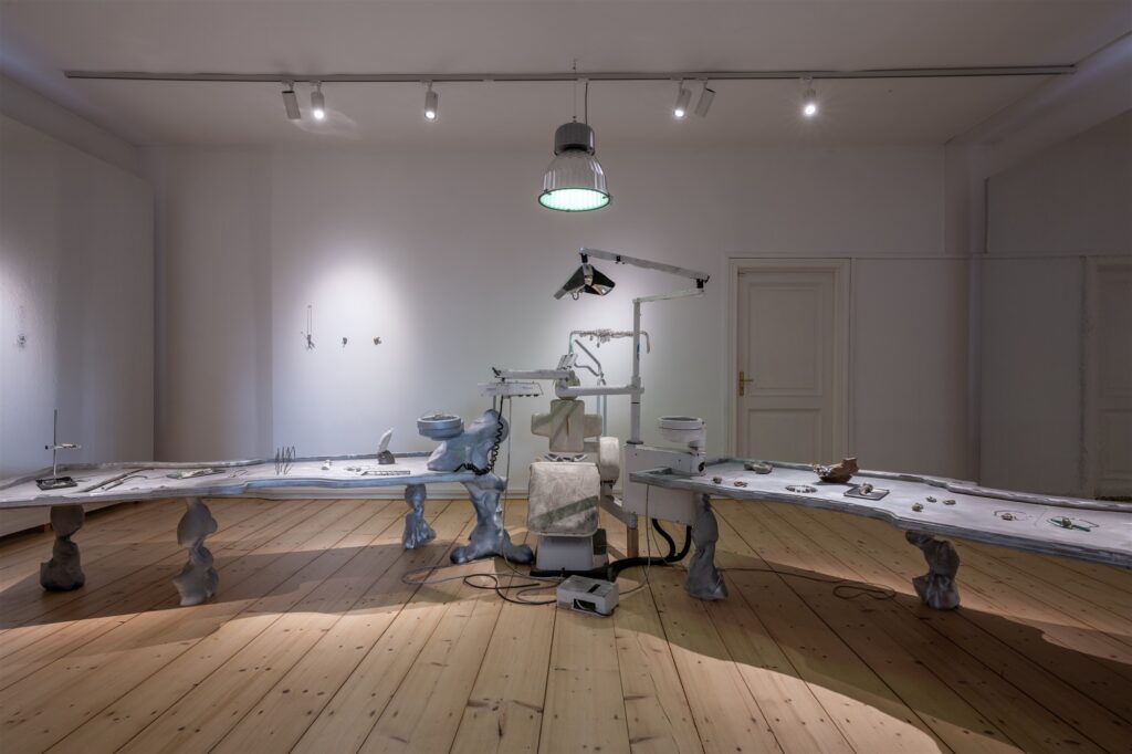 Darja Popolitova ja Madlen Hirtentreu „Neandertallase ilukabinet“ on välja pandud Eesti Tarbekunsti- ja Disainimuuseumi trepigaleriis. Uksest sisse astudes näeb hüpoteetiline patsient kohe enda ees vana räämas sopast hambaarstitooli. Selle kohal piniseb industriaalne valgusti, mille surisev vool loob umbes samasuguse närvilise helitausta, nagu võis kuulda hiljutisel Jass Kaselaane näitusel. Kahel pool tooli hõbe-ligastel operatsioonilaudadel asuvad kõikvõimalikud hüpoteetilised kosmeetikatööriistad. Otseseinad säravvalged, küljeseinad kaetud ufoliku fooliumkilega. Esimesena hakkab kohe kummitama seos Coralie Fargeat’ eelmise aasta poleemilise body horror filmiga „Protseduur“ ja kuigi selle konnotatsioonid on ilmselged, oleks väär hakata siinset paarisnäitust kellegi teise loomingu kaudu mõtestama.
