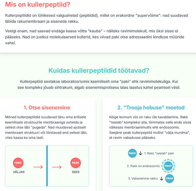 Arvan, et meie ajupeptiididel võiks minna täpselt sama hästi või isegi paremini. See on järgmine suur unistus. Hoian igal juhul iRGD puhul nüüd juba fännina pöialt pihus. Ma ise ei saa enam midagi teha, kuid pall on veerema pandud. Nüüd on minu eesmärk ära kasutada seda teadmist, kogemusi ja kontakte, mis meil ka selle iRGD arendusega tekkisid, et neid saaks rakendada uute, siin Eestis arendatud peptiidide hüvanguks.