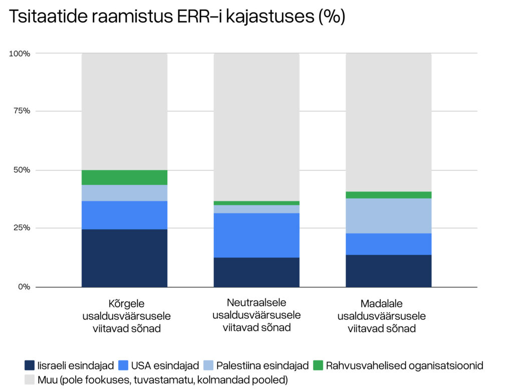 Seda, kuidas ERR asjaosaliste sõnu erinevalt vahendab ja kui usaldusväärsena neid tajutakse, paljastas ka kvantitatiivne analüüs. Vaatlesime uudistes kasutatud tsitaate (sh ümberütlusi) ja seda, kellelt need pärinevad. Suurimateks kategooriateks on Iisraeli, Palestiina, USA ja rahvusvaheliste organisatsioonide esindajad.1 Teiseks jaotasime tsitaatide toimetajapoolse raamistamise võtted kolme rühma: kõrgele usaldusväärsusele viitav raamistus (kinnitama, teatama jm), madalale usaldusväärsusele viitav raamistus (väitma, oletama jm) ja neutraalne raamistus (ütlema, sõnama jm). Analüüsisime 1167 lauset, millest kolmandik sisaldas kõrgele, kolmandik neutraalsele ja kolmandik madalale usaldusväärsusele viitavaid sõnu või konstruktsioone.