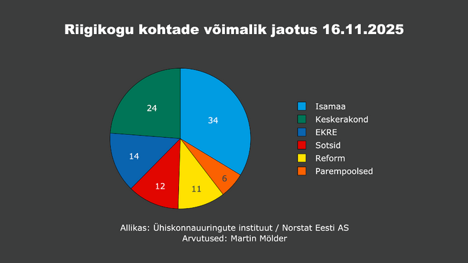 Riigikogu kohtade võimalik jaotus 16.11.2025 Autor/allikas: Ühiskonnauuringute Instituut