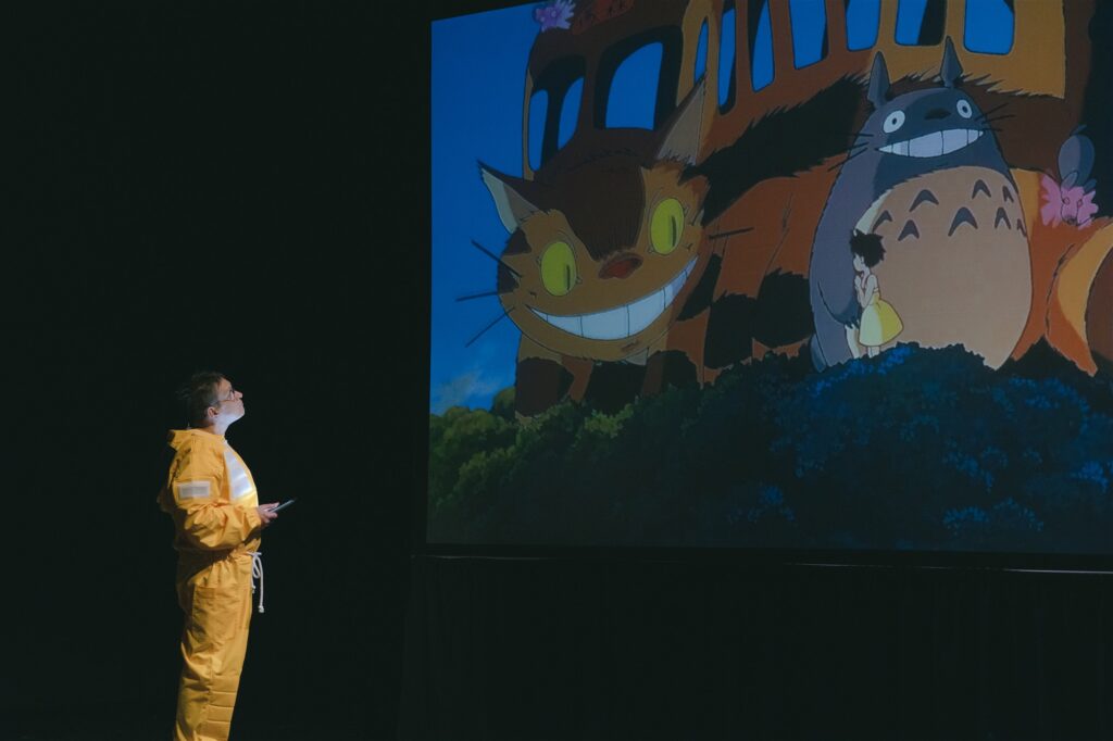 Ja ongi lahe. Loenglavastuses räägib professor Taavi noorteadlastele (ehk lastele) paradoksist, puuksu jõul liikuvast konnast, sise- ja välismaailmast ning jaapani animekunstnikust Hayao Miyazakist. Professor Emer ja tehisaru aitavad seda kõike visualiseerida. Vaheajal saab endas peituva looma paberile joonistada, et loengu jätkudes tehisaru abil vaadelda tema „sisemist potentsiaali“. Nagu ma „Teatrielu 2024“ kogumikus olen kirjutanud,1 vahendab lavastus rahustavat sõnumit, et loominguline olend on ikkagi inimene, masin saab teda toetada – ideid täiendada või (ala)teadvuses tekkinud pilte taasluua.