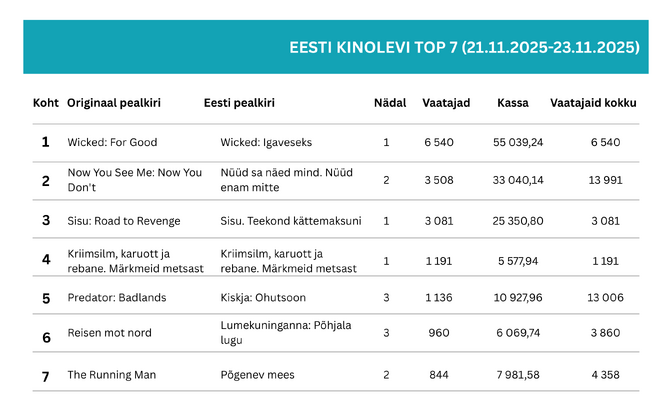 Eesti kinolevi top 7 perioodil 21.11.2025–23.11.2025 Autor/allikas: EFI