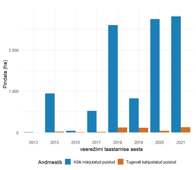 Aastatel 2013 kuni 2021 taastatud soometsade kogupindala ja samadel aladel tugevalt kahjustatud puistute pindala. Autor/allikas: Indrek Hiiesalu