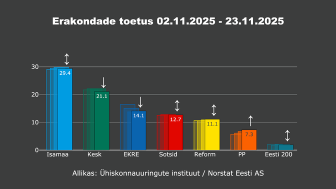 Liidrikohal oleva Isamaa toetus nädalaga märkimisväärselt ei muutunud ning seega on peatunud erakonna kohalike valimiste järgne tõus. Samuti on peatunud teist kohta hoidva Keskerakonna tõus – nende toetus langes nädalaga ühe protsendipunkti võrra. Kolmandal kohal oleva EKRE toetus pöördus kohalike valimiste järel langusesse, kuid värskete tulemuste põhjal on ka see trend peatunud.