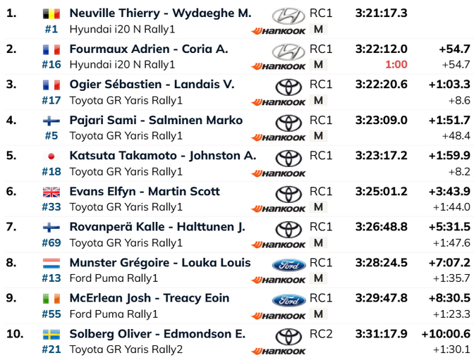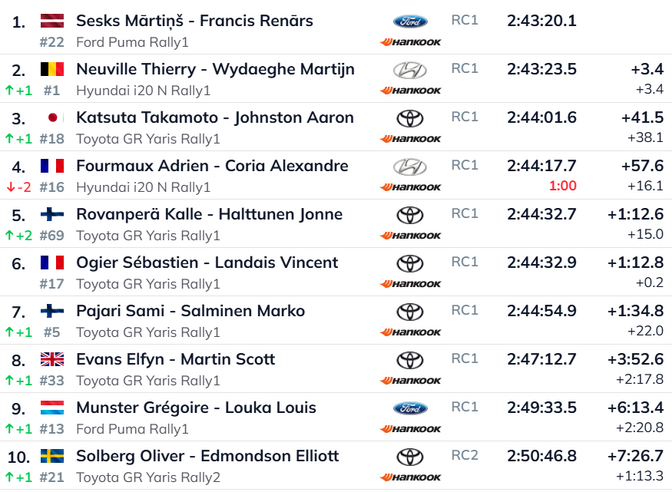 Kokkuvõttes on eestlane neljas (+13,7), edu lähima jälitaja Thierry Neuville’i (Hyundai) ees on 1,2 sekundit. Esikolmiku moodustavad Fourmaux, Pajari (+6,0) ja Sesks (+6,9).