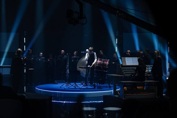 Klassikatäht Karl Martin Tombak musitseerimas Tallinna Filharmoonia kammerkoori ja dirigent Tõnu Kaljustega Autor/allikas: Ken Mürk/ERR
