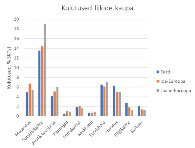 Joonisel on esitatud graafiliselt statistilised andmed kulutuste kohta ülalnimetatud kümnes valdkonnas. Välja on toodud kulutused Eestis, EL-i Ida-Euroopa riikides keskmiselt ning Lääne-Euroopa riikides keskmiselt. Valdkonnad on järjestatud alustades neljast sellisest, kus Eesti kulutused on tunduvalt madalamad kui teistes riikides. Järgmised kolm valdkonda on sellised, kus Eesti kulutused on enam-vähem samasugused kui võrdlusriikides. Kolm viimast on sellised, mis võiksid arvandmete poolest kärpijatele huvi pakkuda.
