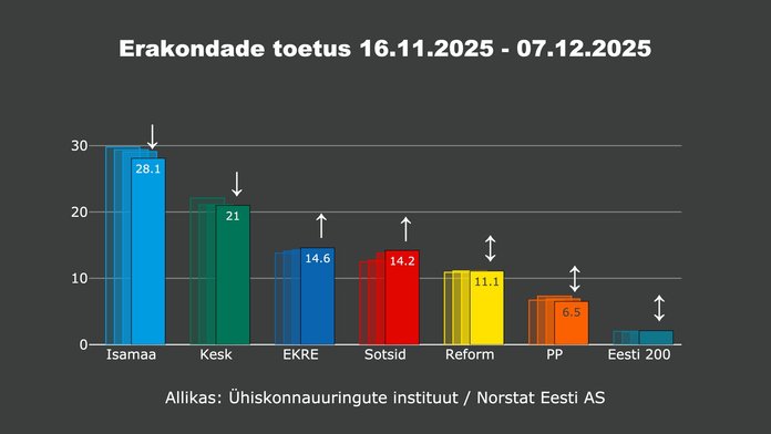 Liidrikohta hoidva Isamaa toetus on viimase kolme nädalaga langenud 1,7 protsendipunkti võrra. Reitingutabelis vastavalt teist ja kolmandat kohta hoidvate Keskerakonna ja EKRE toetus ei ole viimastel nädalatel märkimisväärselt muutunud.