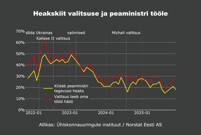 Kord kuus küsitakse lisaks erakondlikule eelistusele vastajatelt arvamust valitsuse ja peaministri tegevuse kohta. Viimaste tulemuste põhjal arvab 28% vastajatest, et valitsus teeb oma tööd väga hästi või pigem hästi ning 66% vastajatest, et valitsus teeb oma tööd pigem halvasti või väga halvasti. 18% vastajatest kiidab heaks, kuid 62% vastajatest ei kiida heaks seda, kuidas Kristen Michal saab oma tööga peaministrina hakkama.