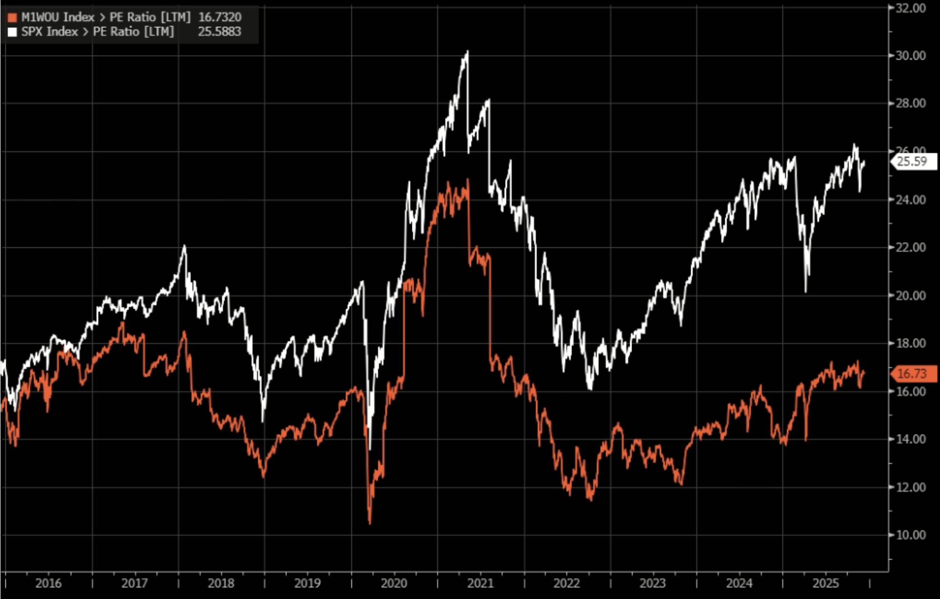Üks lahendus võiks olla ülekaalustada globaalseid aktsiaturge, välja arvatud USA-d, ETF-ide kaudu. Kui vaatame indeksite väärtusi, näeme, et S&P 500 kaubeldakse umbes 25,6-kordse aastakasumiga (valge aktsia). See on oluliselt kõrgem keskmisest ja väärtus on võrreldes eelmise aastaga tõusnud 16-kordselt 26-kordselt. minimem 2022. aastal. Kui aga vaadata ülejäänud aktsiaturgu, siis kaubeldakse selle tootlusega 16,7 korda suurem kui kasum (oranž). See indeks kaubeldi 2022. aastal 12 korda suurema kasumiga, seega on see samuti väärtuse tõus, kuid kaugeltki mitte nii suur kui USA aktsiate puhul. Kui vaatame hindamisgraafikut, näeme, et globaalse indeksi (välja arvatud USA) väärtus on umbes selle pikaajalise keskmise lähedal. Seega on tõsi, et globaalsed aktsiad on kallid, kuid see on peamiselt tingitud USA aktsiatest.