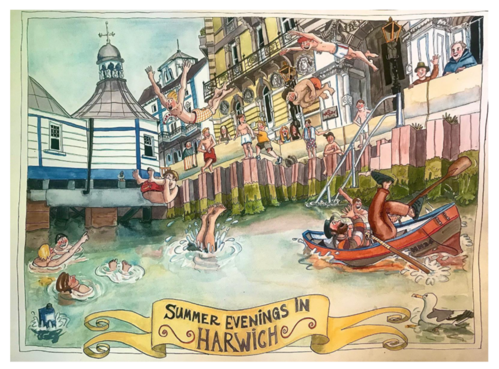 Selle pildi tegin Harwichis, kus mõnda aega elasin. Seal, nagu paljudes Inglismaa vaesemates piirkondades, on haridus kehv ja tööpuudus suur. Kai ääres on silt kirjaga „Sukeldumine keelatud!“. Ja ometi on lapsed alati suveõhtuti sadamas sukeldumas käinud. Palju parem kui kodus telefonis passida! Teismelised naeravad, eputavad tüdrukute ees, ärritavad pahuraid vanainimesi, kellele see tegelikult omamoodi meeldib – kõik on tore ja ilus ja tervis tuleb. Minu sõber Sarah Souther ütleb, et hirm on sageli kunstlik ega tulene reaalsusest või elutarkusest. Neile lastele on arvutute põlvkondade kogemuse tõttu teada, kui kõrge peab olema mõõn, enne kui nad saavad sukelduda. Ja ometi, isegi mina suudan kujutleda, et kui kas või üks laps kõigi Briti laste seast end sadamas vigastaks ja sellest kirjutataks ajalehtedes, keelataks sadamates sukeldumine järsku kõikjal. Õnneks ei teeks Harwichi lapsed ilmselt sest keelust välja ja jätkaksid ilusat traditsiooni – sest nad on üsna metsikud.