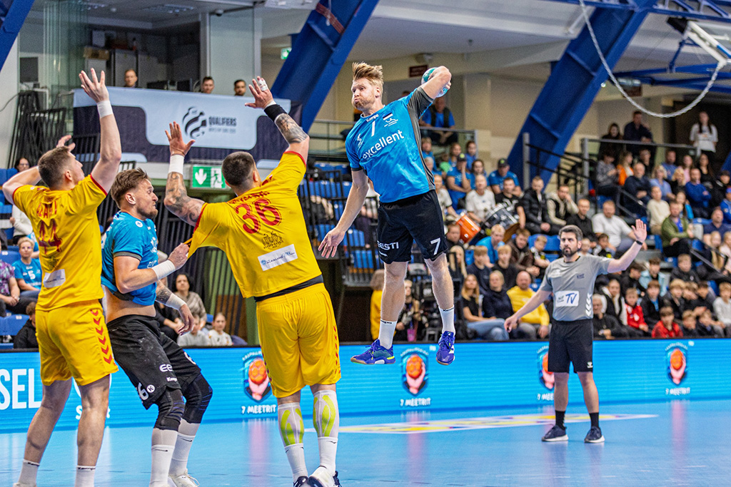 Dener Jaanimaa (palliga) ja meeste koondis alustavad teekonda 2028. aasta EM-i poole eelkvalifikatsioonist. Foto: handball.ee