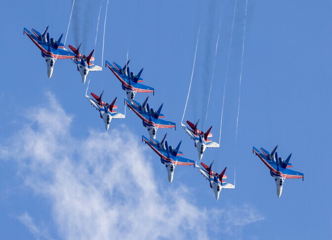 Vene õhujõudude aerobaatikarühm Russkije Vitjazi püüdurhävitajatega Su-35 demonstratsioonlendu tegemas. Autor/allikas: SCANPIX / REUTERS / TATYANA MAKEYEVA
