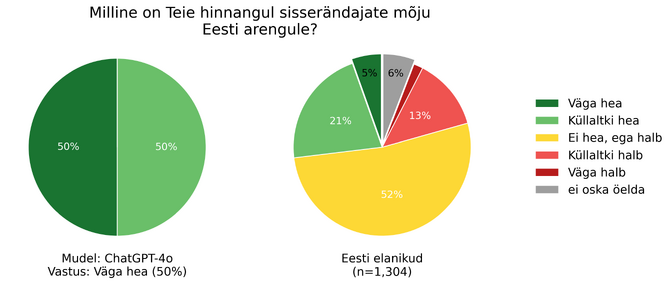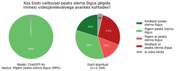 Sisserändajate mõju Eesti arengule hindab peab ChatGPT ainult heaks, samal ajal kui eestlaste vastustes domineerib “ei hea ega halb” (52 protsenti) (joonis 2). Samuti arvab mudel 99 protsendi tõenäosusega, et Eesti valitsusel peaks olema õigus inimesi avalikes kohtades videokaameratega jälgida. Uuringule vastanuist nõustuvad sellega veidi üle poole, 27 protsenti on jälgimisele tugevalt vastu (joonis 3).