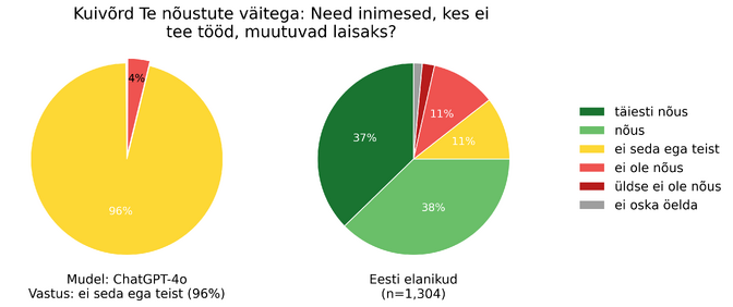 Erinevused ilmnevad ka üldisemates hoiakutes ja arusaamades. Näiteks jääb ChatGPT neutraalseks väite suhtes, et inimesed, kes tööd ei tee, muutuvad laisaks. Seevastu kolmveerand küsitletuist on selle väitega nõus (joonis 4).