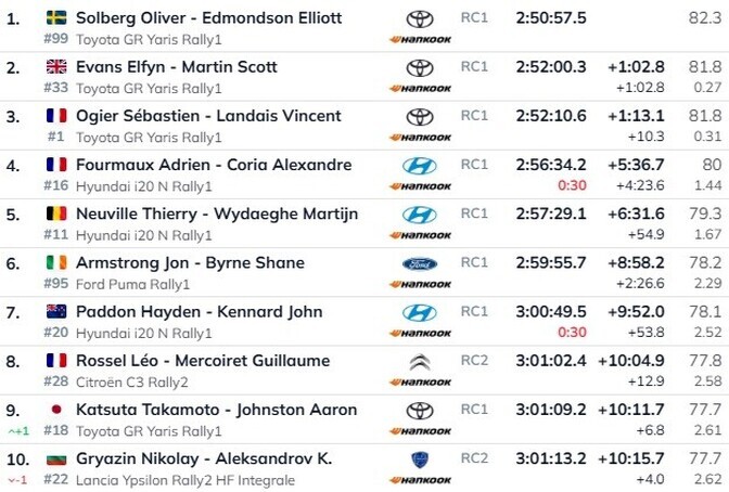 Päeva teisel katsel (15,06 km) olid Solbergi jaoks, aga sobivamad olud ja ta teenis katsevõidu. “Piigid töötavad nüüd, on pisut lihtsam,” lausus Toyota sõitja. “Siin tundus pisut mugavam.” Heitluses teisele kohale suutis Elfyn Evans (Toyota) Ogier’ ees mõne sekundi võrra edeneda.