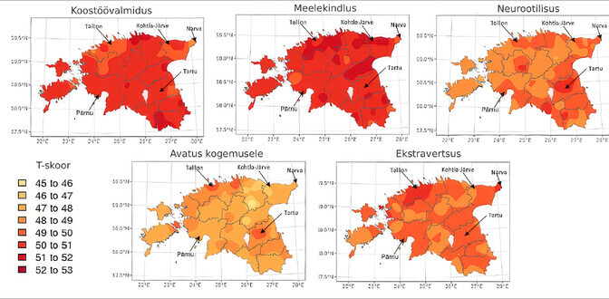 Kui teadlased oma tulemused kaardile kandsid, ei joonistunud sealt esiti välja midagi põrutavat. Autor/allikas: Rene Mõttus jt/Journal of Personality