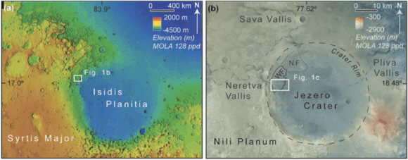 Contexto del cráter Jezero y Neretva Vallis, donde está Perseverance (NASA).