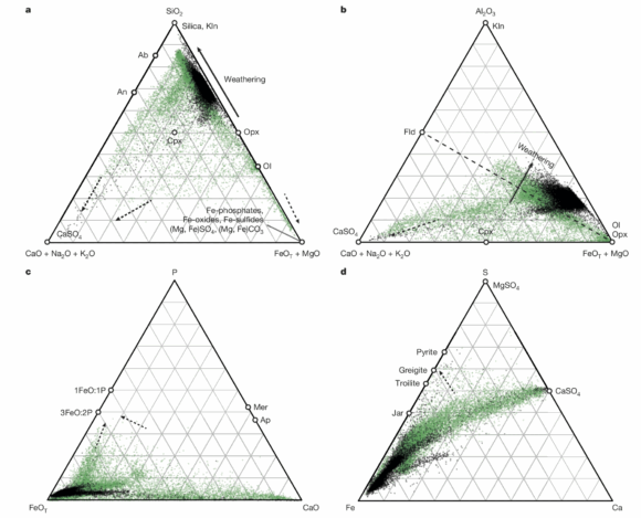 Diagramas con las proporciones molares de determinados elementos y óxidos detectados por el instrumento PIXL (Joel A. Hurowitz et al.).