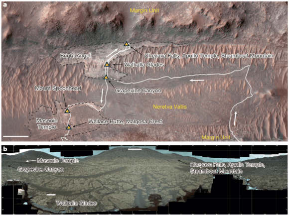 Lugar de la roca Cheyava Falls en Neretva Vallis (NASA/JPL-Caltech/ASU/MSSS).
