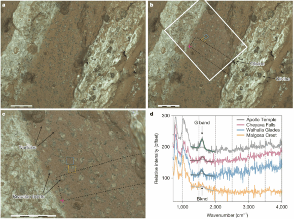 a) Imagen nocturna de la cámara WATSON de Cheyava Falls tomada en el Sol 1188 a 3,91 cm de distancia. La resolución es de 21.0 ± 0.4 µm por píxel. b) La imagen de WATSON con la imagen del instrumento SHERLOC obtenida en los Soles 1201-1202 a unos 4 cm de distancia con una resolución de 10 µm por píxel. d) Espectros Raman de SHERLOC Raman (NASA/JPL-Caltech/MSSS).