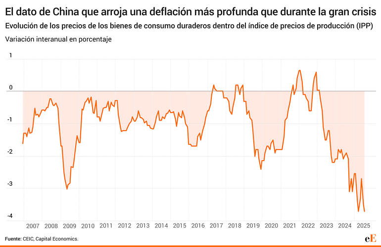 «Aún es demasiado pronto para concluir que la campaña contra la involución esté teniendo éxito, sobre todo porque se han adoptado pocas medidas políticas concretas«, se pronuncian Zichun Huang y Julian Evans-Pritchard, analistas de Capital Economics, en una nota para clientes. Y apuntan a dos datos bastante esclarecedores. La deflación en fábrica en el sector del automóvil, uno de los principales objetivos de la campaña, se mantuvo sin cambios. Asimismo, la deflación en los bienes de consumo duraderos dentro de los precios de producción se agravó hasta alcanzar el -3,7% interanual el mes pasado, un ritmo de descenso de los precios más rápido que durante la crisis financiera mundial.