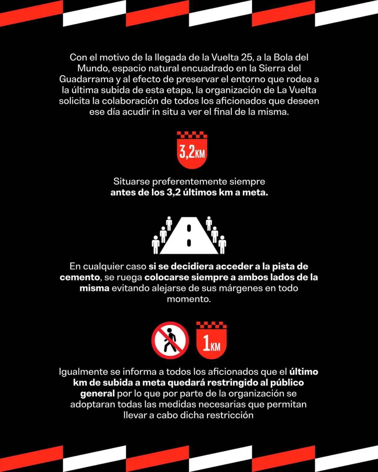 Por último, la organización ha dispuesto medidas adicionales para el último kilómetro de subida hacia la meta, que estará restringido al público en general. Esto se hace con el objetivo de asegurar la correcta realización de la prueba y garantizar que los ciclistas puedan llegar al final de su recorrido en las mejores condiciones posibles, sin interferencias de los espectadores. Desde la organización de La Vuelta, se recuerda que el cumplimiento de estas normas no solo es crucial para la seguridad de todos los presentes, sino también para el buen desarrollo de la prueba. «Gracias por vuestra colaboración», se lee en los carteles informativos, haciendo un llamado a la conciencia colectiva y al respeto por el medio ambiente, dos principios que no deben pasar desapercibidos en este tipo de eventos.
