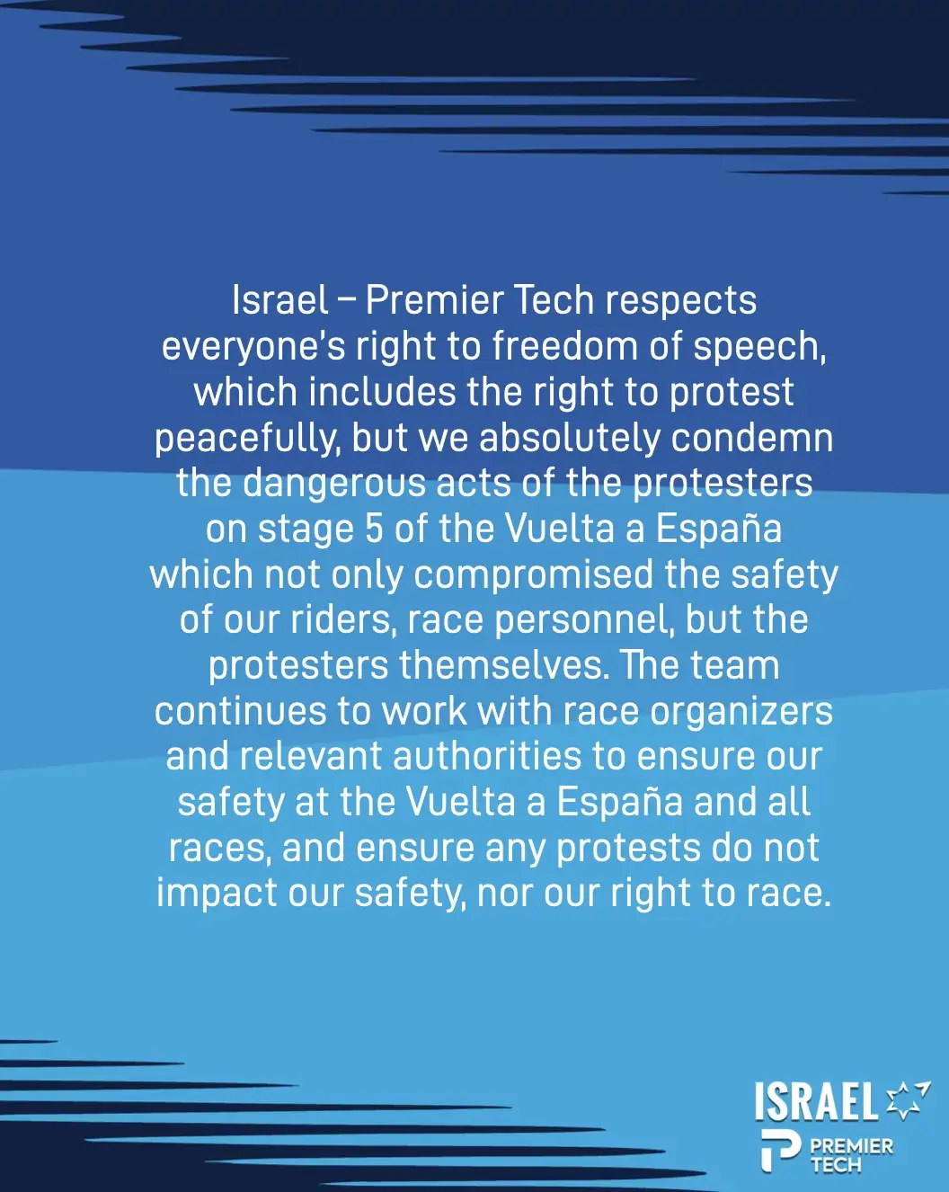 «Israel-Premier Tech es un equipo ciclista profesional. Como tal, el equipo mantiene su compromiso de seguir compitiendo en la Vuelta a España. Cualquier otra decisión sentaría un peligroso precedente en el ciclismo, no solo para Israel-Premier Tech, sino para todos los equipos. Israel-Premier Tech ha expresado en repetidas ocasiones su respeto por el derecho de todos a protestar, siempre y cuando dichas protestas sean pacíficas y no comprometan la seguridad del pelotón. La organización de la Vuelta a España y la policía están haciendo todo lo posible para crear un entorno seguro y, por ello, el equipo les está especialmente agradecido. Sin embargo, el comportamiento de los manifestantes hoy en Bilbao no solo ha sido peligroso, sino también contraproducente para su causa y ha privado a los aficionados vascos al ciclismo, algunos de los mejores del mundo, de la llegada de etapa que se merecían».