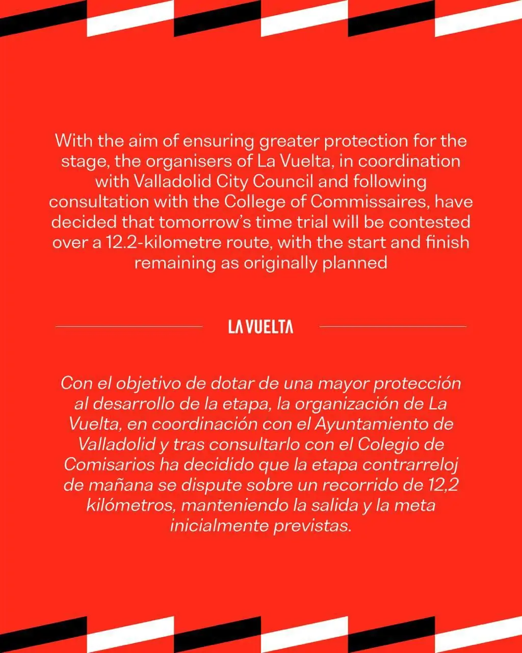 10 septiembre. La organización de La Vuelta a España anunció una modificación en el recorrido de la 18ª etapa en forma de contrarreloj individual que se disputará mañana en Valladolid. «Con el objetivo de garantizar una mayor protección» durante el desarrollo de la jornada, la dirección de carrera, en coordinación con el Ayuntamiento de Valladolid y tras consultar al Colegio de Comisarios, «ha decidido que la prueba se dispute sobre un trazado de 12,2 kilómetros». Pese a este ajuste, tanto la salida como la meta se mantendrán en los lugares inicialmente previstos, respetando la planificación original del evento.