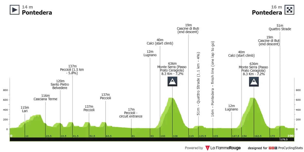 La UC Pecciolese ha presentado oficialmente el trazado del Giro de la Toscana de esta temporada, que se disputará el miércoles 10 de septiembre. La clásica de la región de Italia central volverá a tener salida y meta en Pontedera con un total de 189,4 kilómetros. El punto clave de la jornada será, una vez más, el circuito del Monte Serra, que los corredores afrontarán en dos ocasiones después de un doble paso previo por La Tabaccaia. La dureza de esta ascensión convierte la carrera en terreno ideal para escaladores, aunque el desenlace no está del todo cerrado: el final será llano, lo que abre la puerta a otro tipo de resoluciones si los equipos logran controlar.