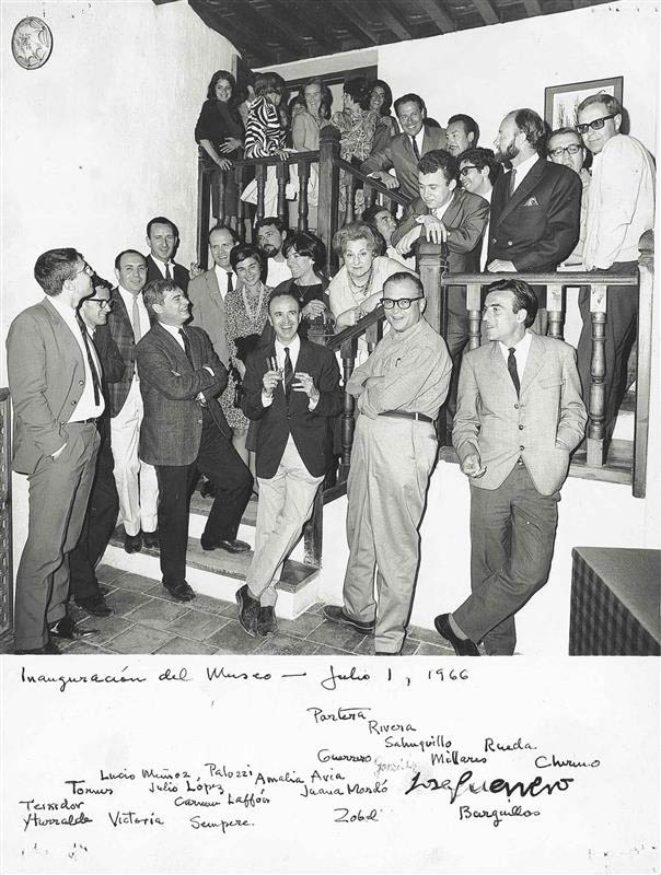 Fotografía del grupo de artistas y amigos asistente a la apertura del Museo de Arte Abstracto Español, Cuenca. De izquierda a derecha y de abajo arriba: José María Yturralde, Jordi Teixidor, Salvador Victoria, Eusebio Sempere, Fernando Zóbel y Jaime Burguillos (primera fila); Gustavo Torner, Lucio Muñoz, Julio López Hernández, Carmen Laffón, Rinaldo Paluzzi, Amalia Avia, Juana Mordó y José Guerrero (segunda fila); José Abad, Nicolás Mateo Sahuquillo, Manolo Millares, Gerardo Rueda y Martín Chirino (tercera fila); una mujer sin identificar, Juan Manuel Ruiz de la Prada, una mujer sin identificar, Roxane W. Pollock (esposa de José Guerrero), Elvireta Escobio (esposa de Manolo Millares), Margarita Argenta (esposa de Martín Chirino), Alberto Portera y Manuel Rivera (última fila). Archivo Fernando Zóbel, Biblioteca y Centro de Apoyo a la Investigación, Fundación Juan March, Madrid. Foto: Fernando Nuño.