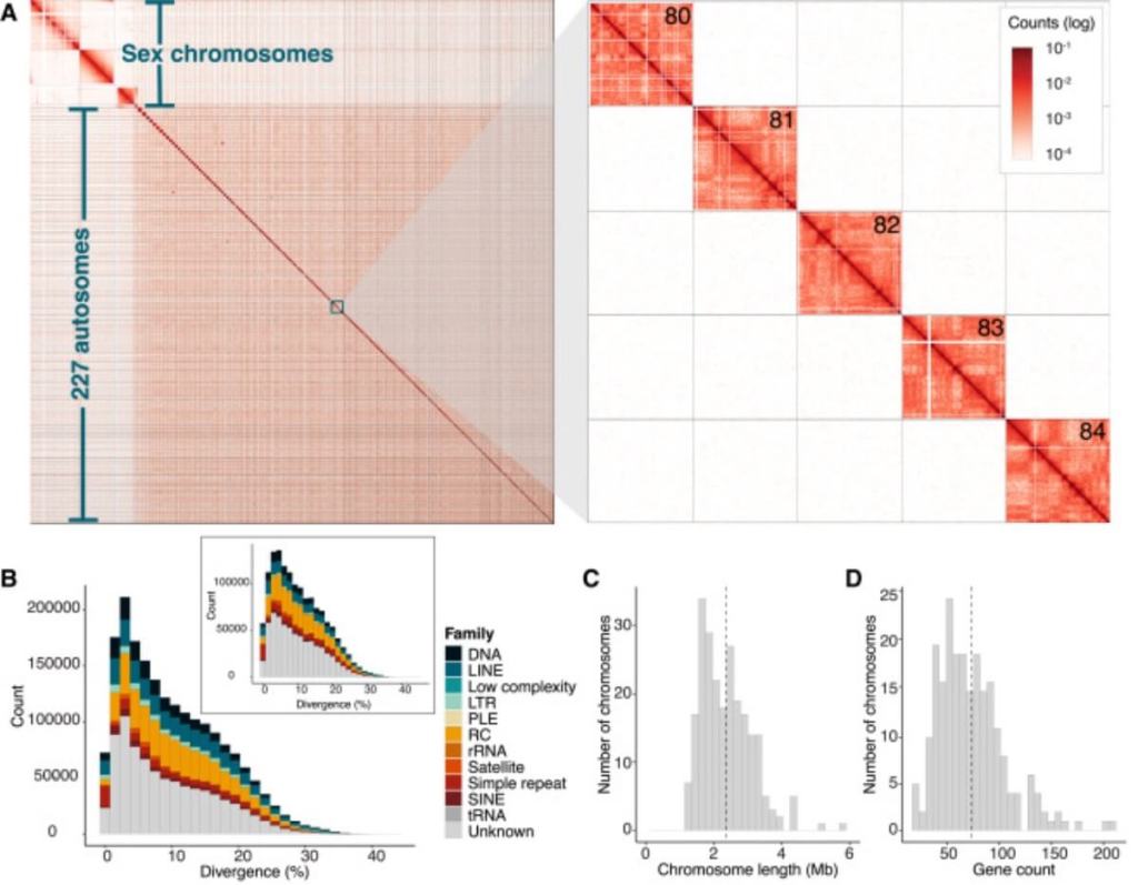El nuevo trabajo identificó 227 pares de autosomas (los cromosomas que no están implicados en la determinación del sexo) y cuatro cromosomas sexuales (dos Z y dos W). Esta estructura rompe por completo con la estabilidad cromosómica típica de los animales, una estabilidad que ha permitido a los biólogos reconstruir cómo eran los genomas de nuestros ancestros más remotos.