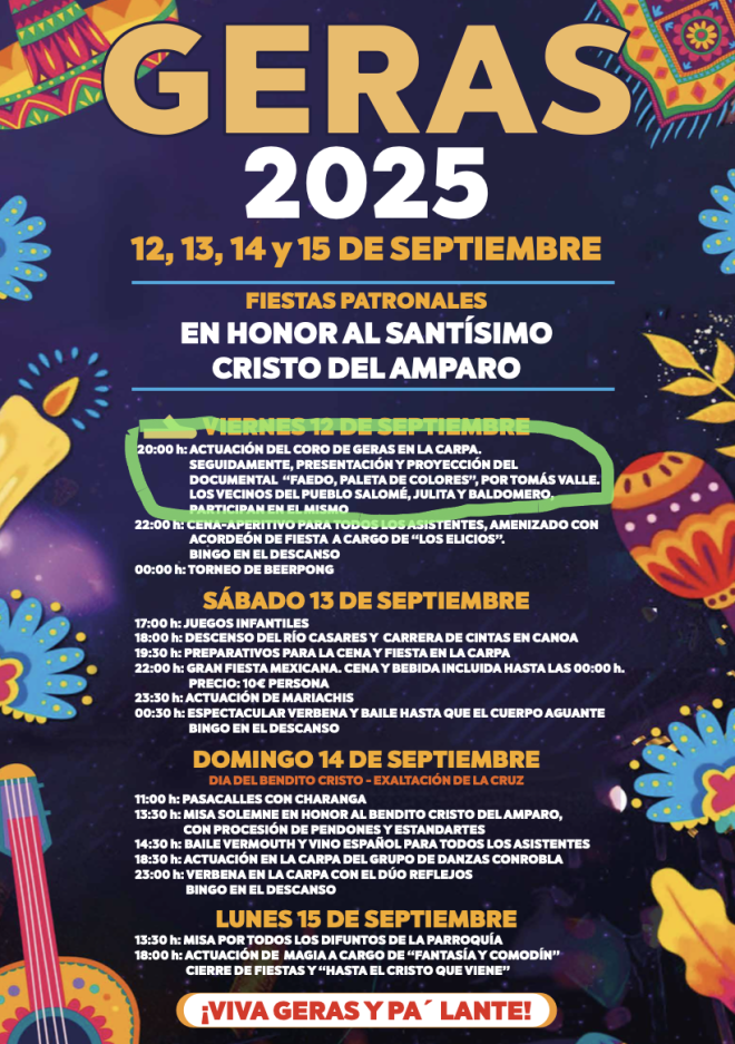El cine será protagonista esta tarde de viernes en Geras de Gordón, dentro de sus fiestas patronales, con la proyección del documental ‘Faedo, paleta de colores’, dirigido por Tomás Valle. La cita tendrá lugar a las 20 horas y supone un reencuentro muy especial entre el cineasta, el pueblo y algunos de los protagonistas de la obra.