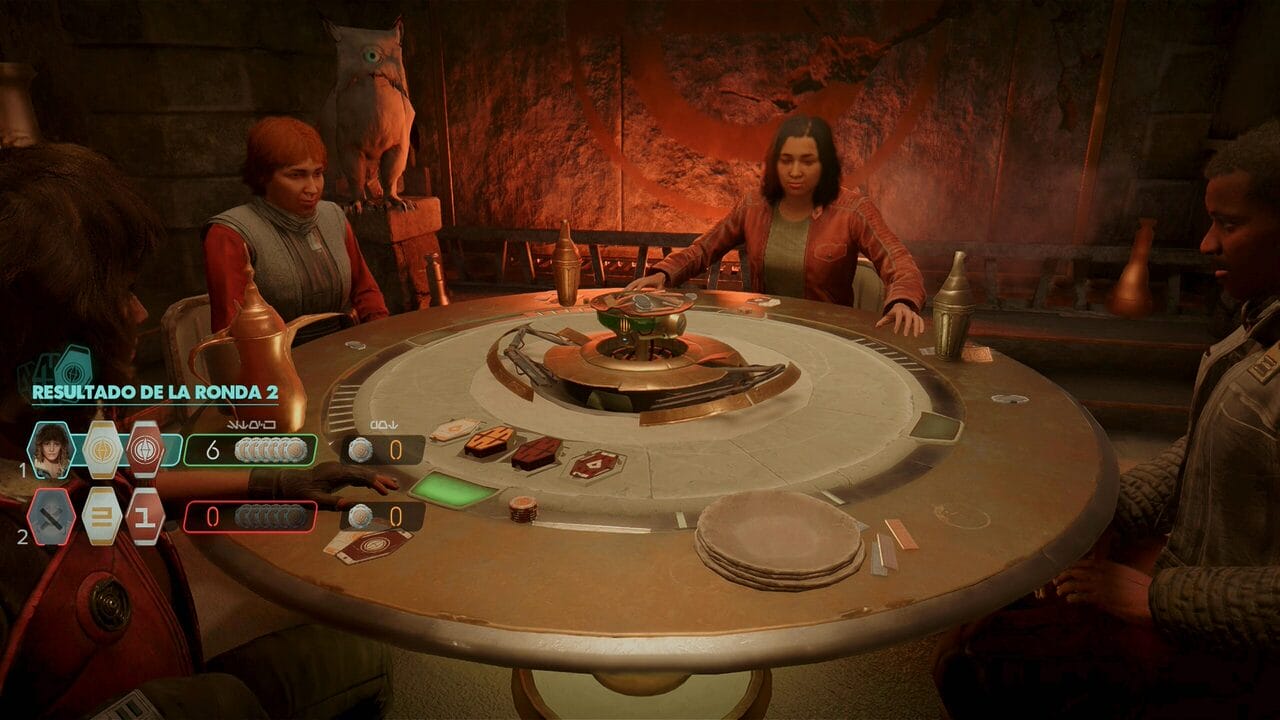 El Sabacc es un juego de cartas original original del universo Star Wars que he de decir que no conocía. Outlaws te permite aprender a jugarlo… con trampas, gracias a las habilidades de Kay. Consiste es un juego de parejas, bastante simple, que se complica gracias a algunas variantes. El objetivo es tener la pareja más baja de cartas de dos colores (amarillo/arena y rojo/sangre), por lo que una pareja de 1 es el mejor de los resultados, mientras que de 6 es el peor resultado. A esto añadimos que hay una especie de comodines, llamados Sylop, que pueden incluso ganar a la pareja más baja. Por lo tanto, una carta de 1 y otra de Sylop ganan a la pareja de unos. También tenemos la carta de impostor, que básicamente nos permite lanzar unos dados al final de la mano para tratar de conseguir una buena carta en función de la numeración obtenida. Y si lo más poderoso es una pareja, si no las hay, la suma de los números de tus cartas más baja es la que gana. Todo esto para tratar de desplumar las fichas necesarias para robar una nueva carta. Si te quedas sin ellas, pierdes dado que no puedes seguir jugando.