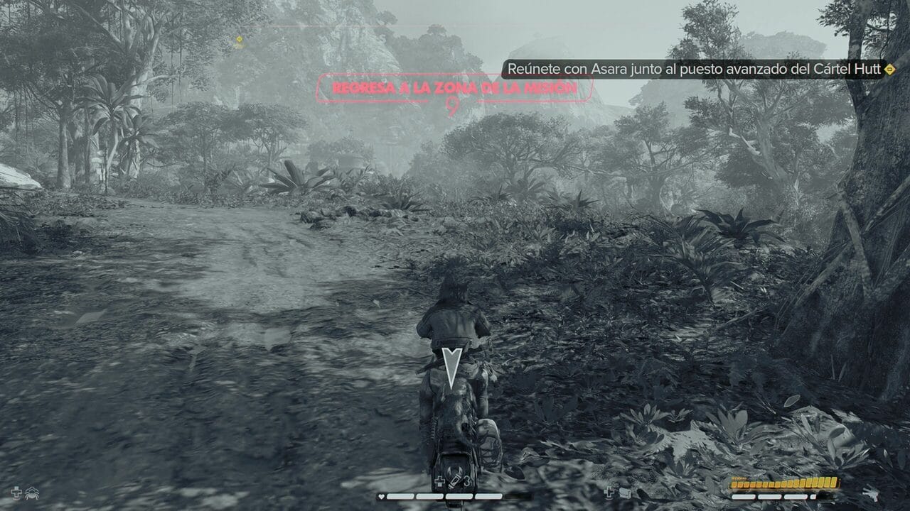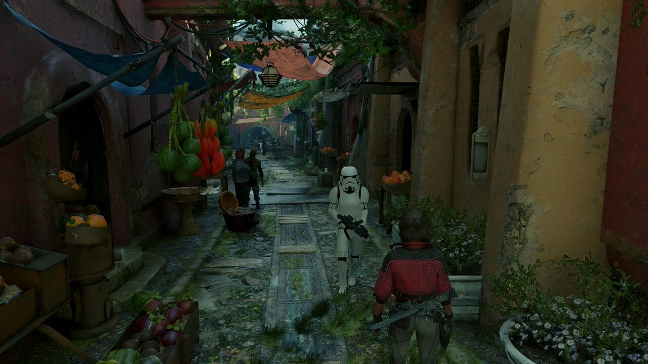 Sin embargo, pese a estos ajustes que permiten hacer la experiencia más dura (o si lo prefieres o necesitas, un paseo), la jugabilidad se siente más ligera que otros títulos incluso de la misma compañía que recogen sistemas similares de jugabilidad. Por ejemplo, no esperes el nivel de sigilo ni con armas que podrías encontrar en un título de la serie Assassin’s Creed. Simplemente, no es lo que buscaba el equipo, pero una mejor inteligencia artificial para los enemigos habría hecho las cosas más interesantes. En muchas secciones de sigilo, al final me he dejado pillar para ponerme a repartir «hostias» a diestro y siniestro. Kay reparte de lo lindo, es satisfactorio ver como tumba a toda cosa con dos patas con unos pocos puñetazos, siempre que no sean droides o los gorilas de los Hutt.