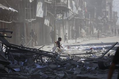 Un joven inspecciona los escombros tras un ataque israelí en el Banco de Palestina en la Ciudad de Gaza, este miércoles. Anadolu (Anadolu via Getty Images)