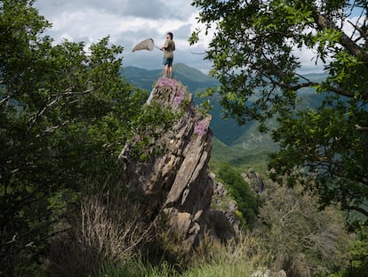 Gerard Talavera, científico del CSIC, cazando mariposas en las inmediaciones del Institut Botànic de Barcelona.Lucas Foglia