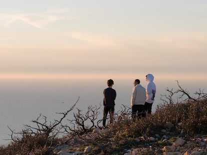 Cuando llegó a Túnez, fue al Cap Blanc, uno de los puntos más septentrionales de África. Las mariposas carderas suelen beber néctar en las flores de estos acantilados antes de lanzarse a cruzar el Mediterráneo. Allí se encontró con tres adolescentes. Mohamed, Amit y Aumen. No debían tener más de 20 años. Eran simpáticos. Le preguntaron qué estaba haciendo y cuando Foglia les explicó su proyecto, ellos se ofrecieron a echarle una mano. Se pasaron la tarde juntos buscando mariposas por los acantilados. “Entonces, uno de ellos me pidió que le hiciera unas fotos junto al mar”. Es una foto bonita. Tres chavales de espaldas ante la inmensidad del Mediterráneo.