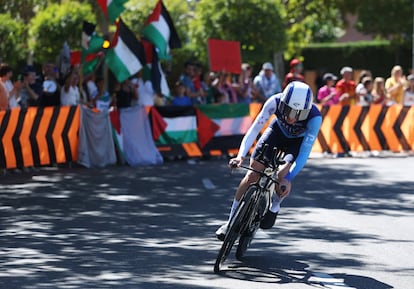 El británico Jake Stewart, del equipo Israel-Premier Tech, rueda ante banderas de Palestina durante la contrarreloj de Valladolid de la pasada Vuelta a España.Juan Medina (REUTERS)