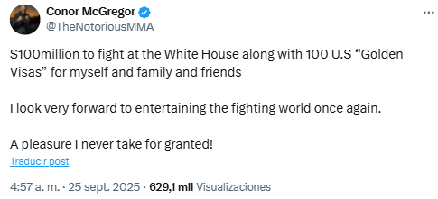En otro posteo, el luchador de 37 años fue claro con lo que pide para participar. “100 millones de dólares por pelear en la Casa Blanca, junto con 100 visas doradas estadounidenses para mí, mi familia y mis amigos. Estoy deseando volver a entretener al mundo de las peleas una vez más. ¡Un placer que jamás doy por sentado!“.