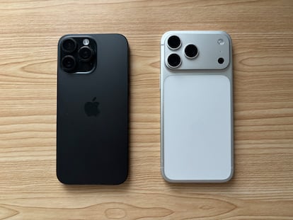 A la izquierda, el iPhone 16 Pro Max (modelo presentado en septiembre de 2024): a la derecha, el nuevo iPhone 17 Pro Max.Isabel RubioMás pesado y grueso que su antecesor