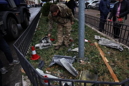 Un militar recopila restos del misil que ha impactado en Kiev en uno de los lugares atacados este domingo por Rusia.Luis de Vega