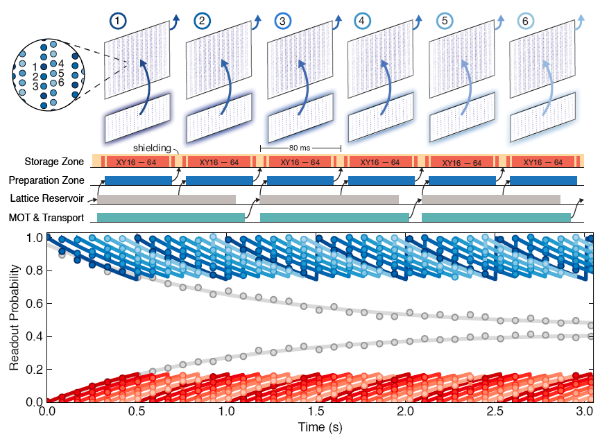 Esta figura ilustra la idea del sistema y una muestra (snapshot) del estados de los átomos en la matriz (se obseva que hay algunas vacantes). También se observa como en el almacenamiento el número de átomos (en color rojo) se mantiene casi constante durante más de 120 minutos (2 horas). Sin el sistema de inyección, el número de átomos decae de forma muy rápida (como se muestra en color gris). La belleza del sistema de inyección de iones no nos debe cegar, el sistema tiene muchos componentes que son fuentes potenciales de error. Por supuesto, se puede soñar con muchas mejoras técnicas en este sistema: la optimización de los tiempos de preparación y lectura, la automatización de la alineación de haces, el uso de ópticas difractivas de mayor eficiencia y de láseres más potentes. Estas mejoras podrían multiplicar por cinco la tasa de recarga y escalar el número de cúbits a decenas de miles (según los autores del estudio, que siempre son más bien optimistas).