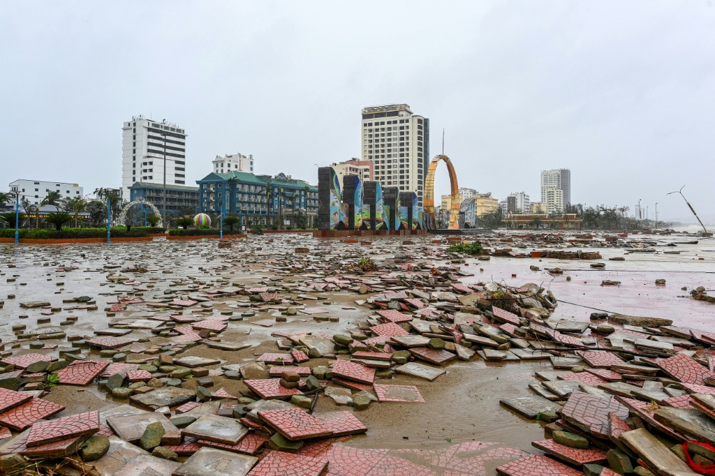 Imágenes publicadas por AFP en el centro de Vietnam muestran techos metálicos arrancados de los edificios y calles repletas de objetos regados que salieron volando de las casas.