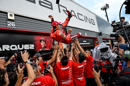 Márquez es manteado por su equipo al llegar al box tras la consecución de su séptimo título, el primero con Ducati.AFP7 vía Europa Press (AFP7 vía Europa Press)