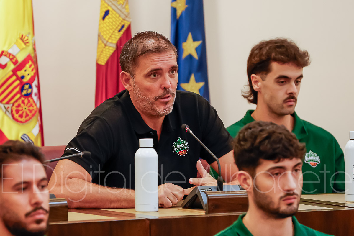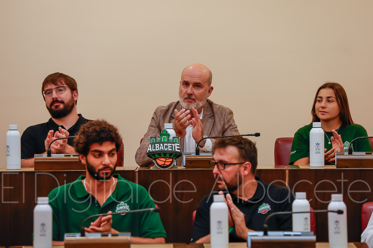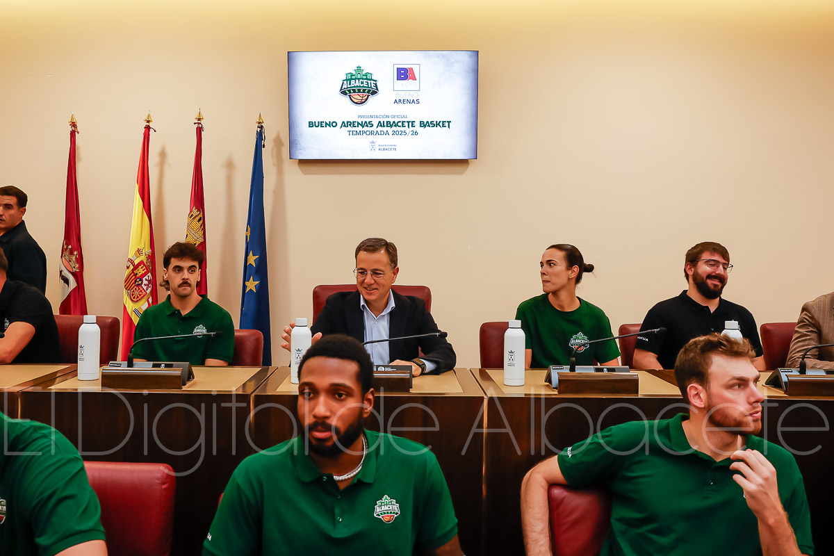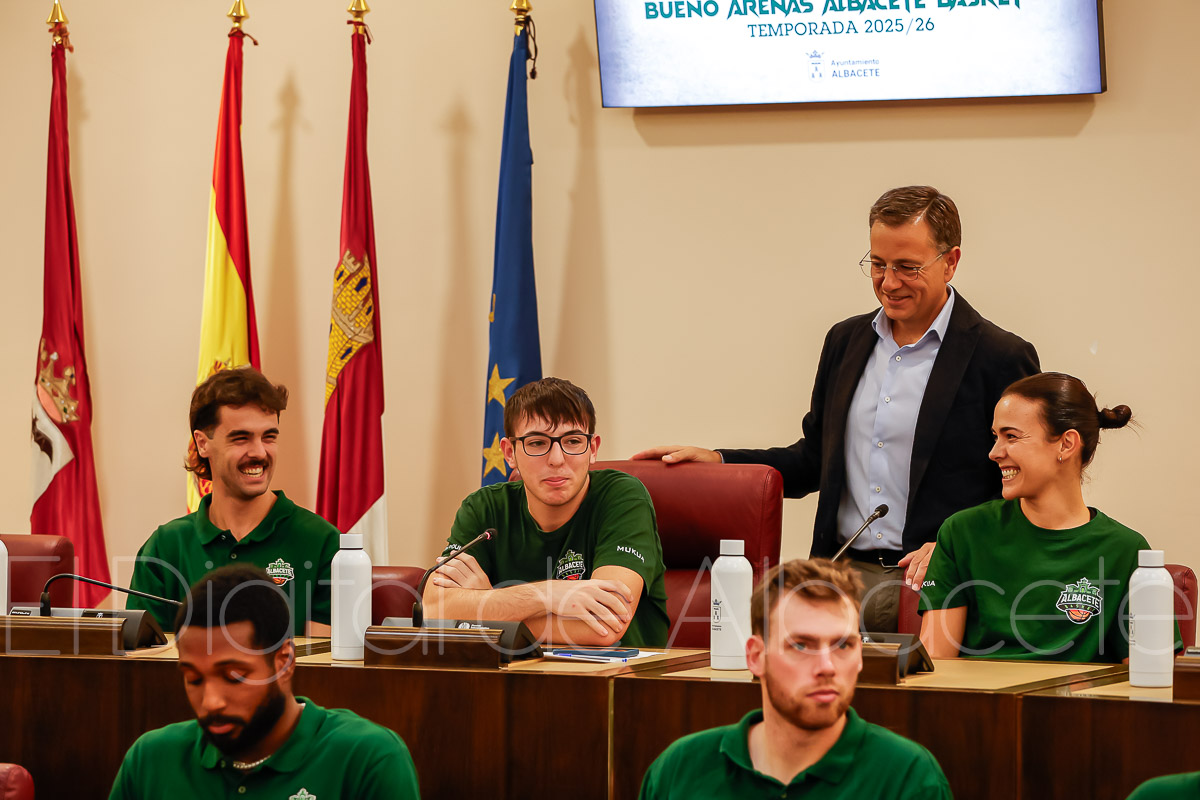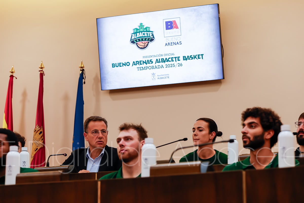 Estas palabras las pronunció Serrano durante la presentación oficial del Bueno Arenas Albacete Basket para la temporada 2025/2026, un acto celebrado en el salón de Plenos municipal. Allí estuvo acompañado por el presidente de la entidad, Rafael Ortega, el técnico del equipo, David Varela, el concejal de Deportes, Francisco Villaescusa, además de otros representantes de la Corporación.