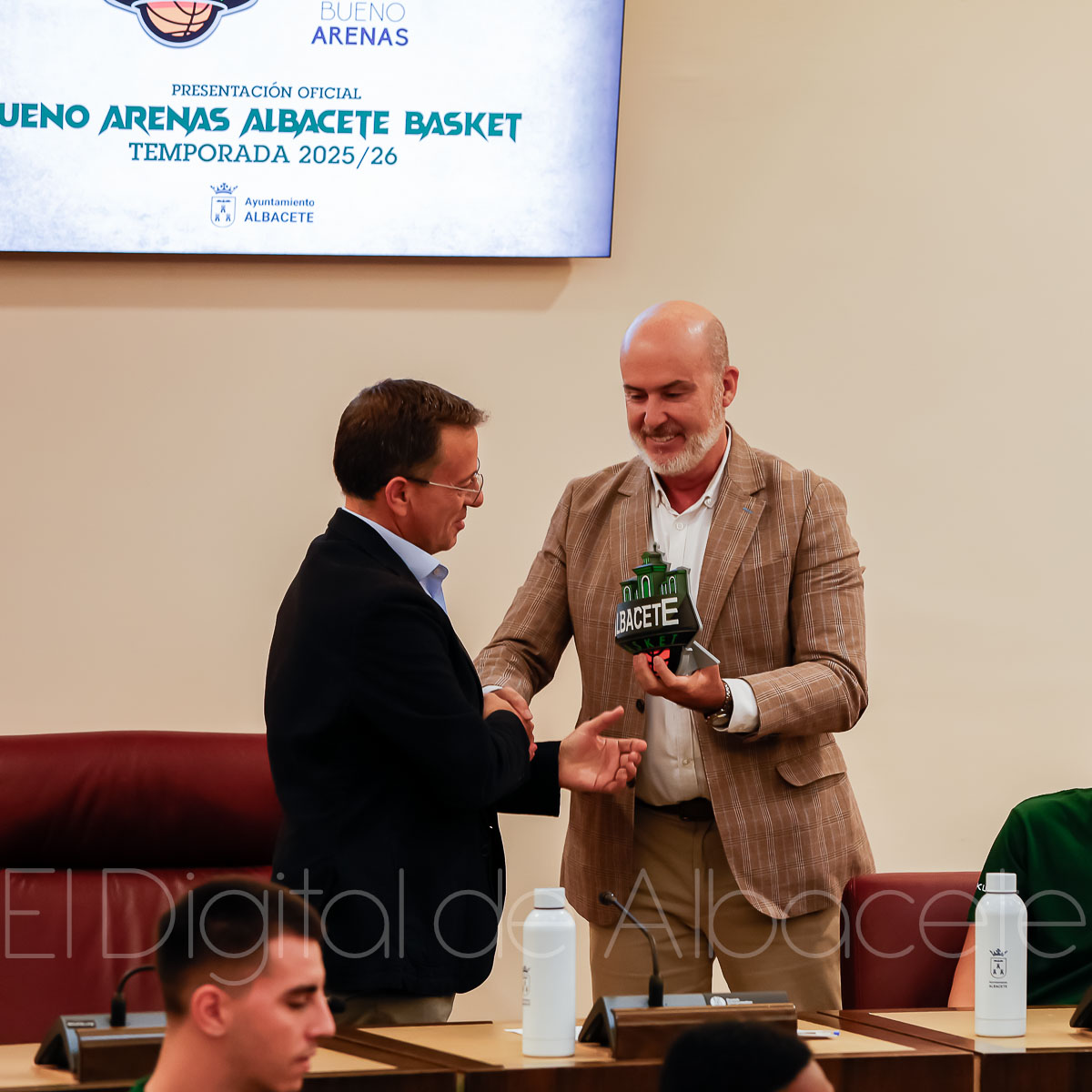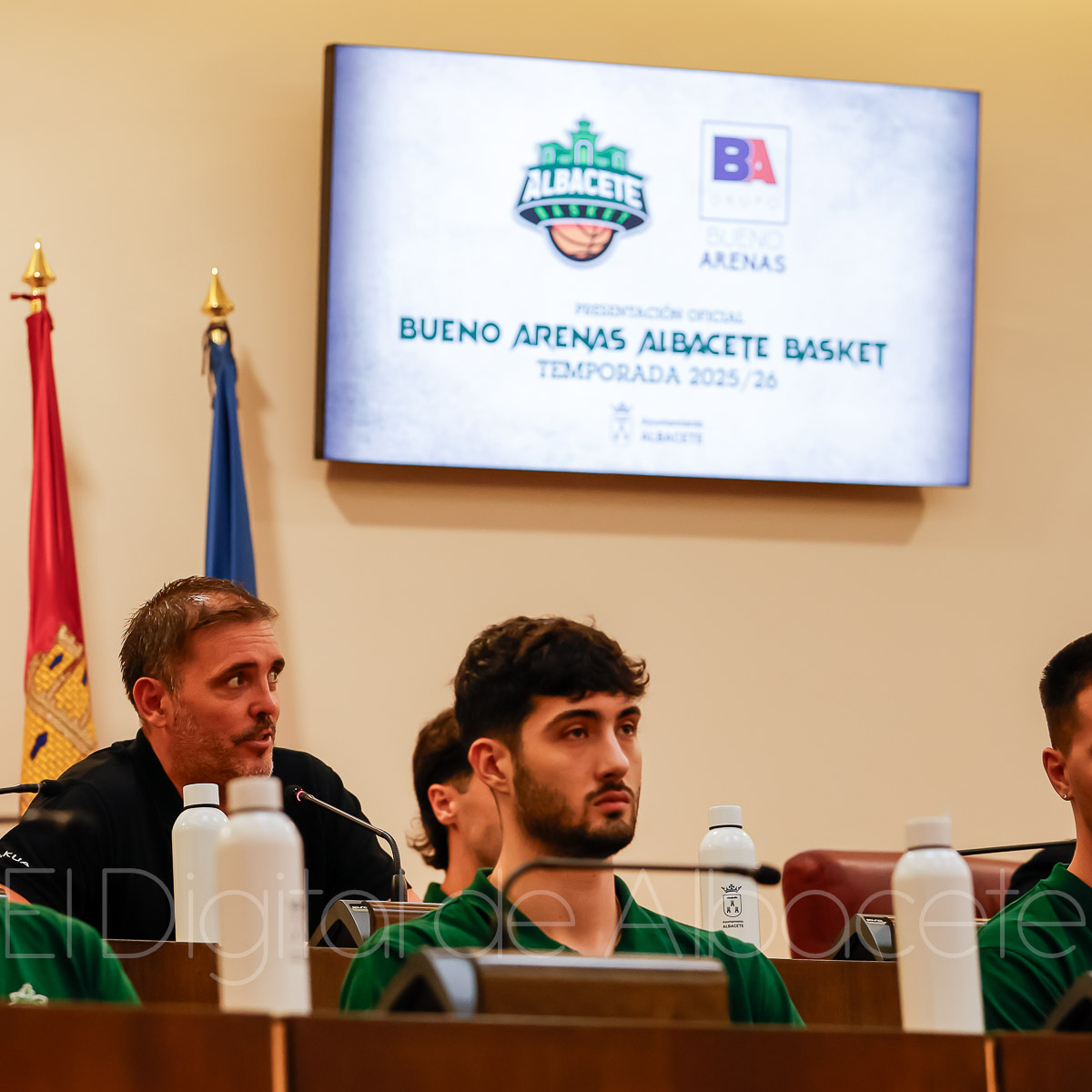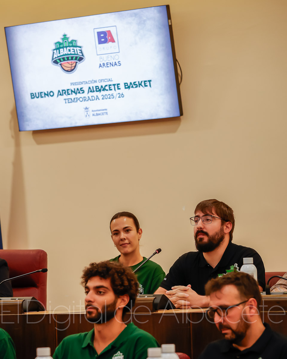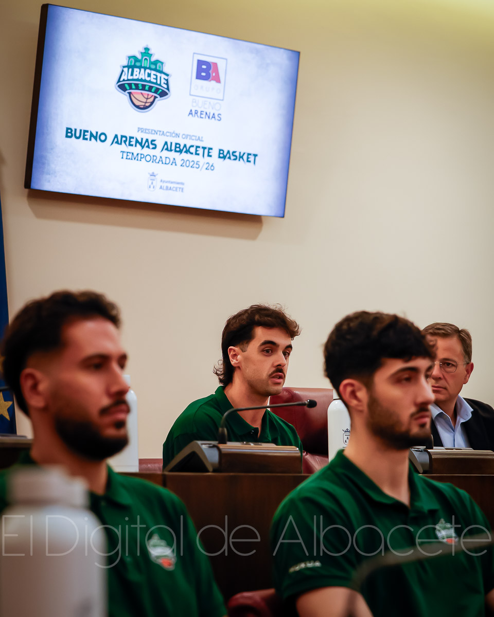 Estas palabras las pronunció Serrano durante la presentación oficial del Bueno Arenas Albacete Basket para la temporada 2025/2026, un acto celebrado en el salón de Plenos municipal. Allí estuvo acompañado por el presidente de la entidad, Rafael Ortega, el técnico del equipo, David Varela, el concejal de Deportes, Francisco Villaescusa, además de otros representantes de la Corporación.