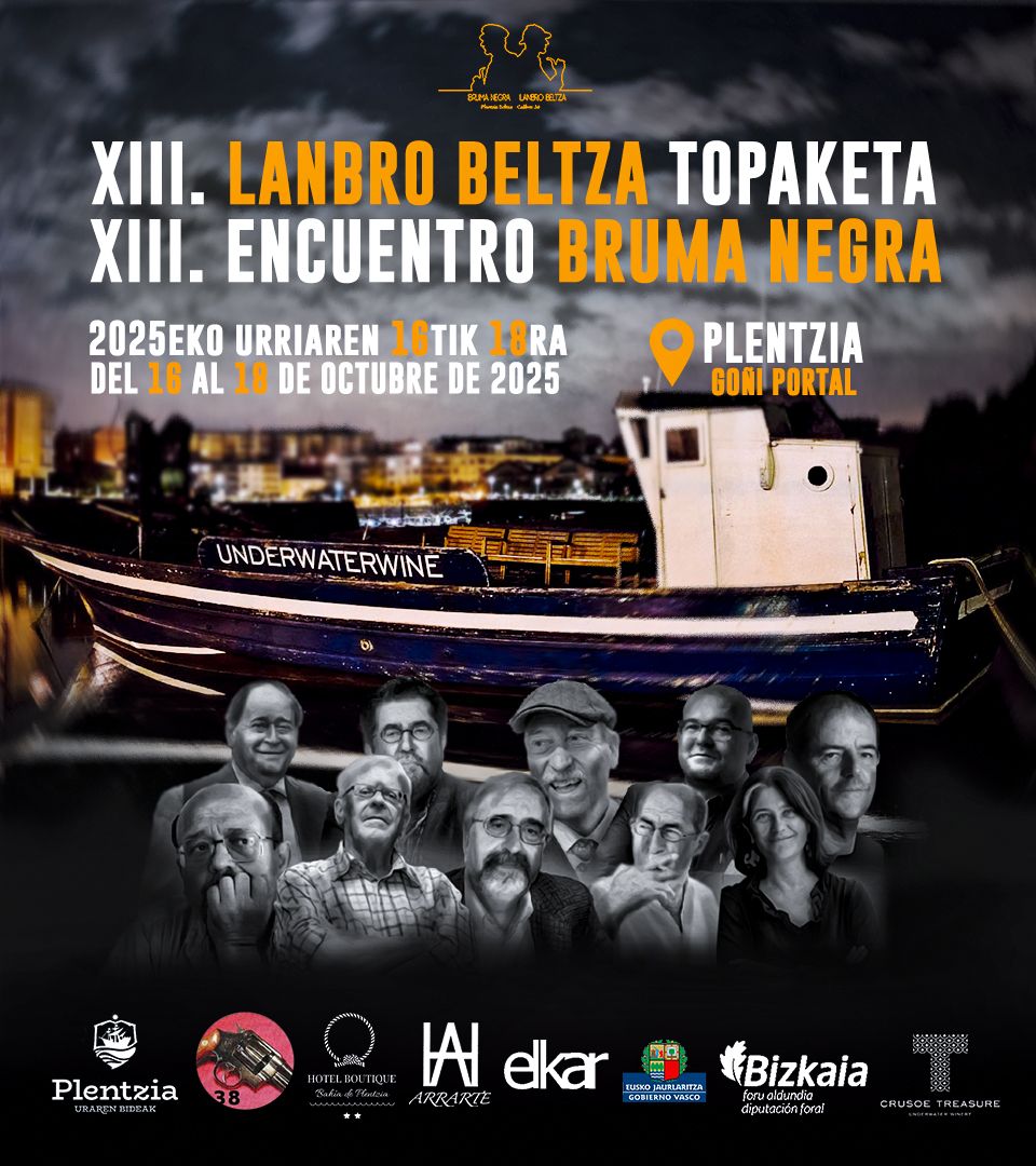 Bruma Negra / Lanbro Beltza Plentzia en su edición número XIII vuelve a congregar en la Casa de Cultura de la Villa de Plentzia (Goñi Portal Kultur Etxea) a lectoras y lectores del género negro (policiaco, thriller, noir) en torno a nueve mesas de debate entre los días 16 y 18 de octubre (el 16 y 17 por la tarde de 18 a 20 y el sábado a la mañana y a la tarde). 26 escritoras y escritores de novela negra (incrementando el número desde el año pasado… con 20 plumas nuevas respecto de la edición 2024) y una criminóloga (Paz Velasco de la Fuente) en la mesa técnica que el pasado año dirigió una médico forense.