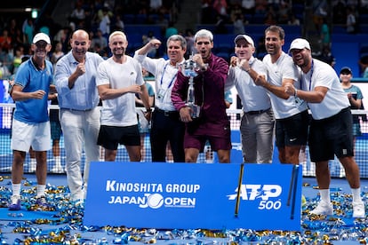 De izquierda a derecha, en torno al tenista: Samuel López (técnico), Tomás Noguera (primo del padre), Juanjo Moreno (fisio y preparador físico), Carlos Alcaraz (padre), Albert Molina (agente), Álex Sánchez (preparador) y su hermano Álvaro.KIYOSHI OTA (EFE)