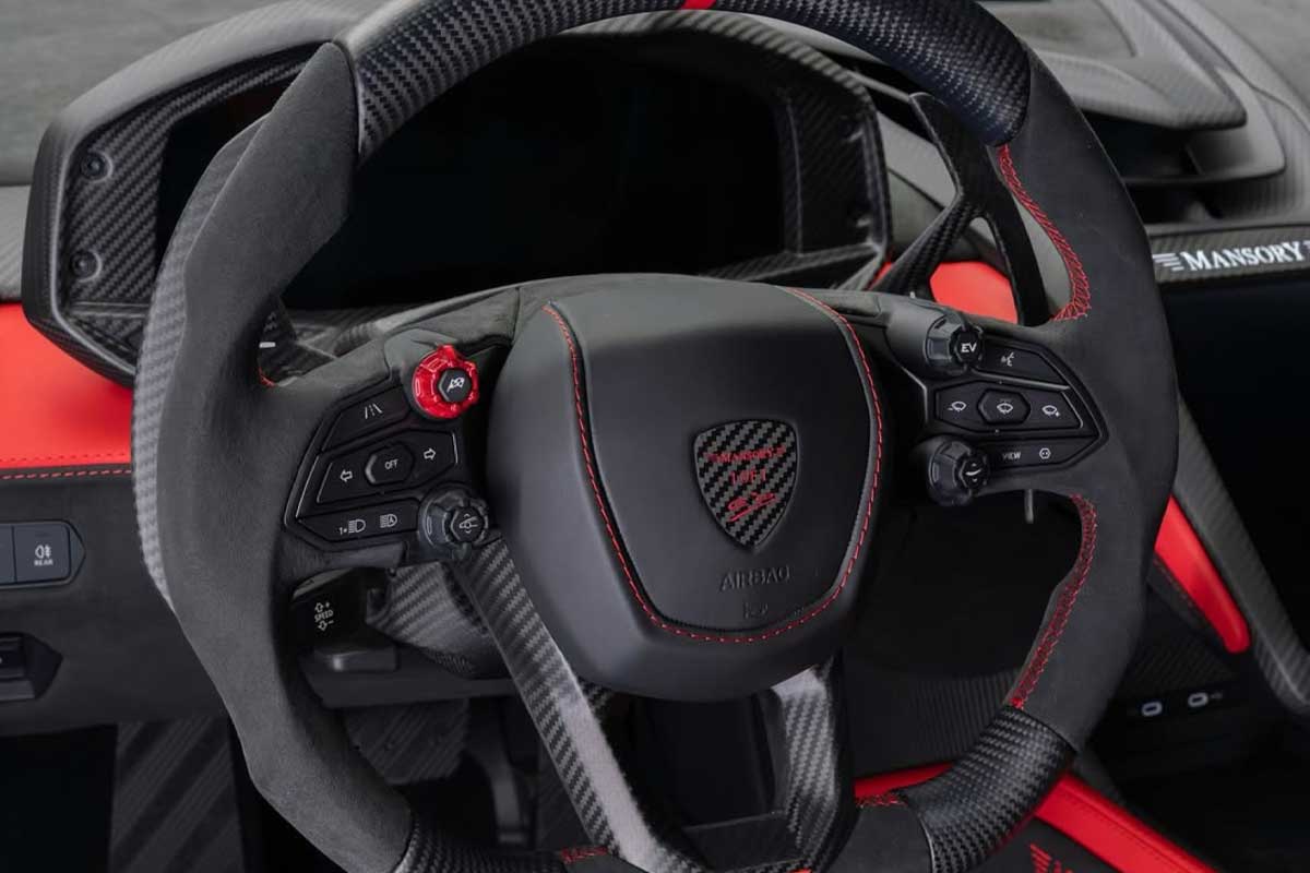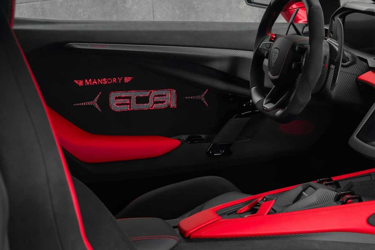 A bordo, domina el rojo. Tapicería de cuero brillante, cinturones de seguridad a juego, inserciones en el salpicadero y la consola central: es imposible permanecer indiferente. El logotipo personal de Esteban Ocon aparece incluso en los paneles de las puertas y en el revestimiento del techo, donde Mansory ha desplazado un detalle poco habitual: el botón de arranque del V12 híbrido de 1.015 CV.